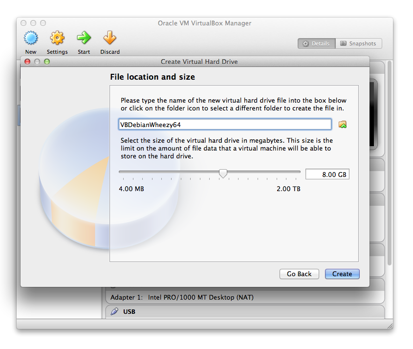 To get started, you need to download two things. The first of these is a disk image file (ISO) for the version of Linux you want to install. These files are different depending on the processor in your computer. For a recent Windows or Mac desktop (i.e., a 64-bit Intel machine), the file that you probably want is debian-testing-amd64-CD-1.iso. For older machines, you may need a different disk image. Check the Debian distribution page for more details. The other thing that you need to download is the Oracle VirtualBox software for your operating system. Once you have downloaded VirtualBox, install it and then start it.