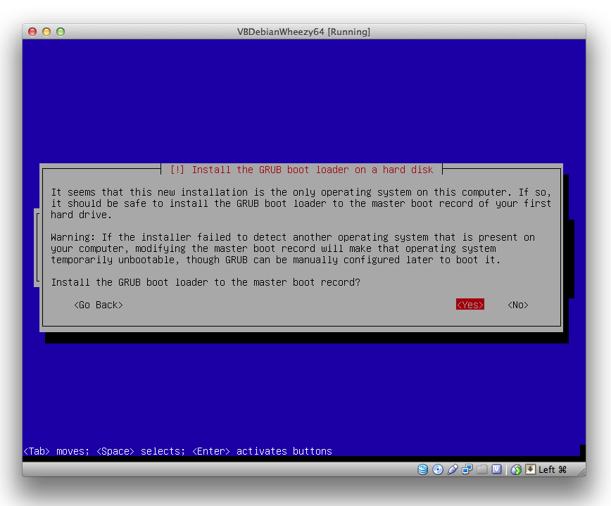 Debian gives you a lot of options for pre-installed bundles of software. On a desktop, I choose only the “Standard system utilities.” If I am on a laptop, I also include the “Laptop” bundle. I leave all of the other ones unchecked. (You can always install more software later.) The “Debian desktop environment” is the GUI, which is mouse-and-icon based, like Windows and OS X. I have found it is much easier to get in the habit of using command line tools if you don’t bother with the GUI, at least at first.