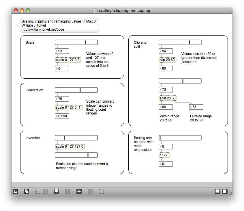 When you are working with continuous values, it is often important to be able to set lower and upper limits, and to scale your values into a particular range. Some basic tools for working with continuous values are presented in the patch below. The raw code link is here.