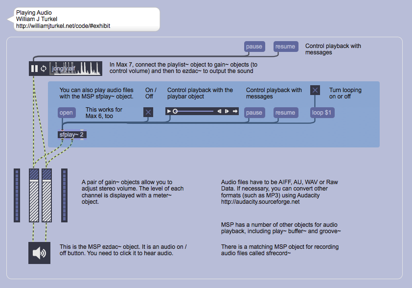 Audio in Max is handled by a layer of objects known as MSP (Max Signal Processing). MSP object names end in a tilde (~) and audio patch cords look differently than Max’s message-passing patch cords. Basic use of the playlist~ (only in Max 7) and sfplay~ objects are demonstrated in the following patch. The raw code link is here.