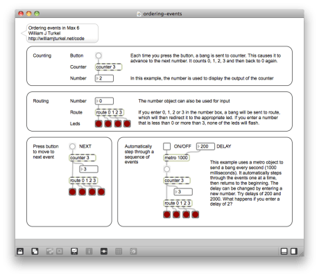 Interaction design focuses on interactions among people, and interactions between people and various kinds of interactive objects, exhibits, installations, environments or systems. These inanimate entities are typically programmed so that they respond to the actions of people. Here we begin to explore some of the mechanisms in Max 6 that allow the programmer to describe basic interactions.
