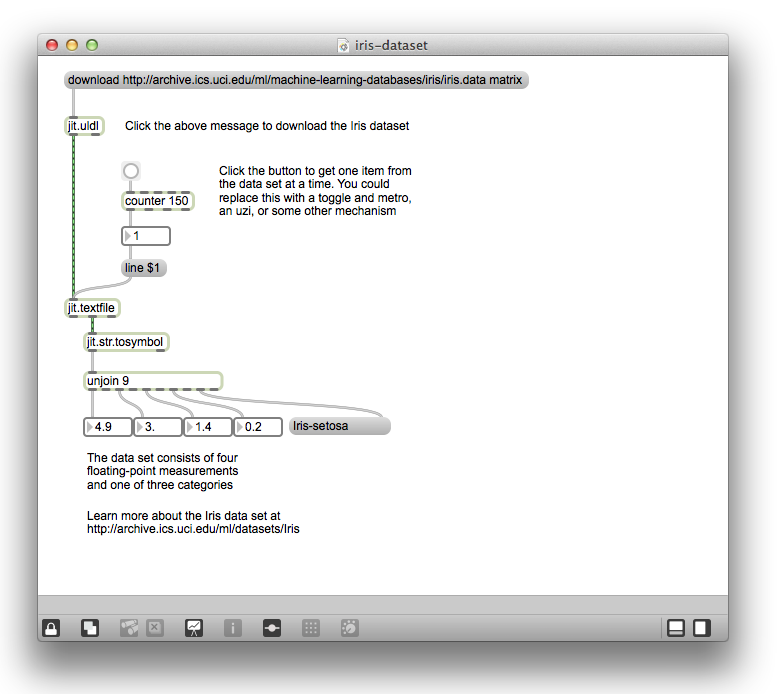 Spend some time familiarizing yourself with the data. You will note that each of the four measurements (sepal length and width, petal length and width) are a small floating point number. In order to convert these values into something that can be easily visualized or sonified, you will probably want to use the scale object. The three classifications (Iris Setosa, Iris Versicolour and Iris Virginica) are currently stored as messages. You can use an object like select to convert these values into useful control information in your patch.